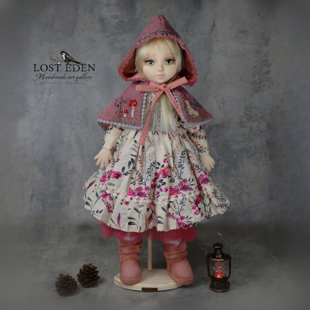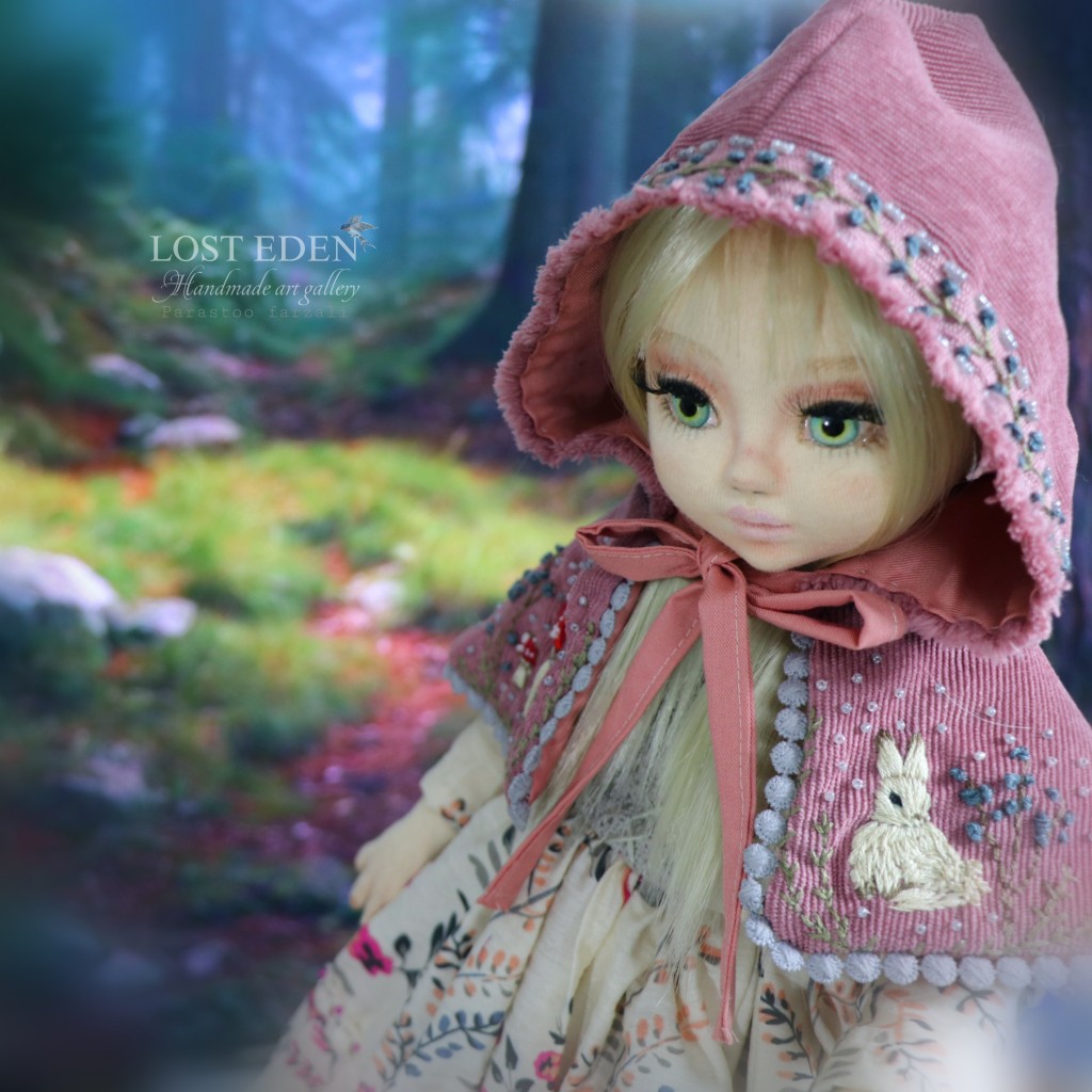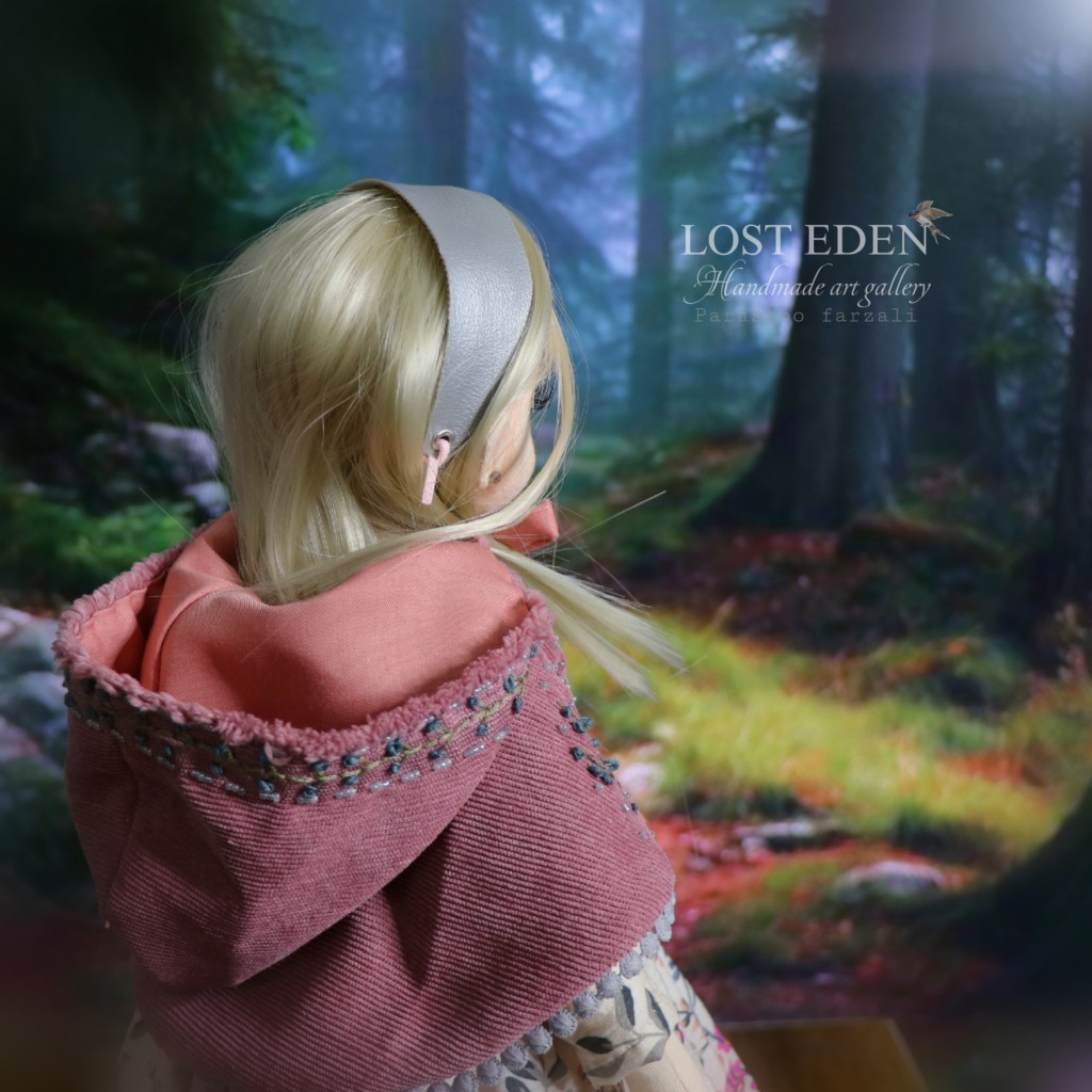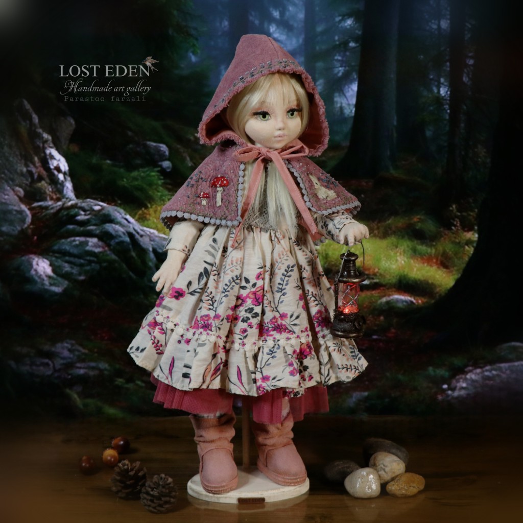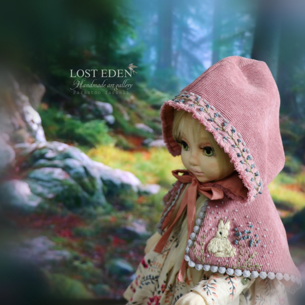 دختری با شنلی به رنگ صورتی مه آلود که بر بسترش خرگوشی سپید که نماد معصومیت و راهنمای ورود به جهانی ناشناخته است و قارچهایی سرخ که رمز و راز جنگل را به رخ میکشند،با هم آغوشی نخ و سوزن نقش بسته اند?