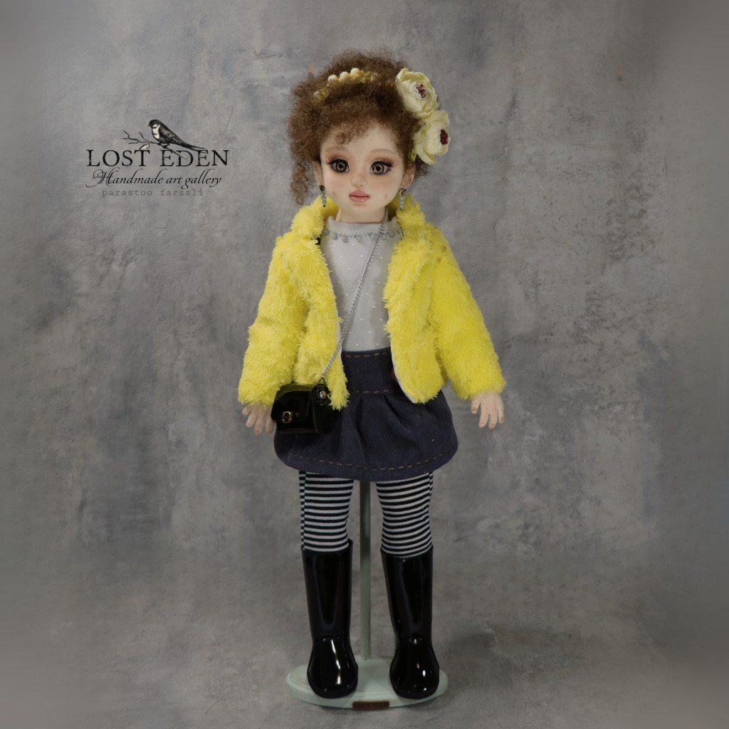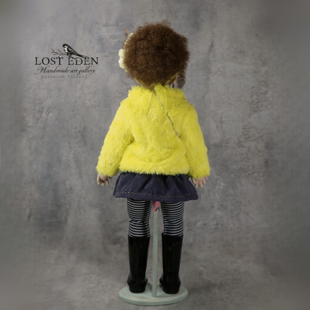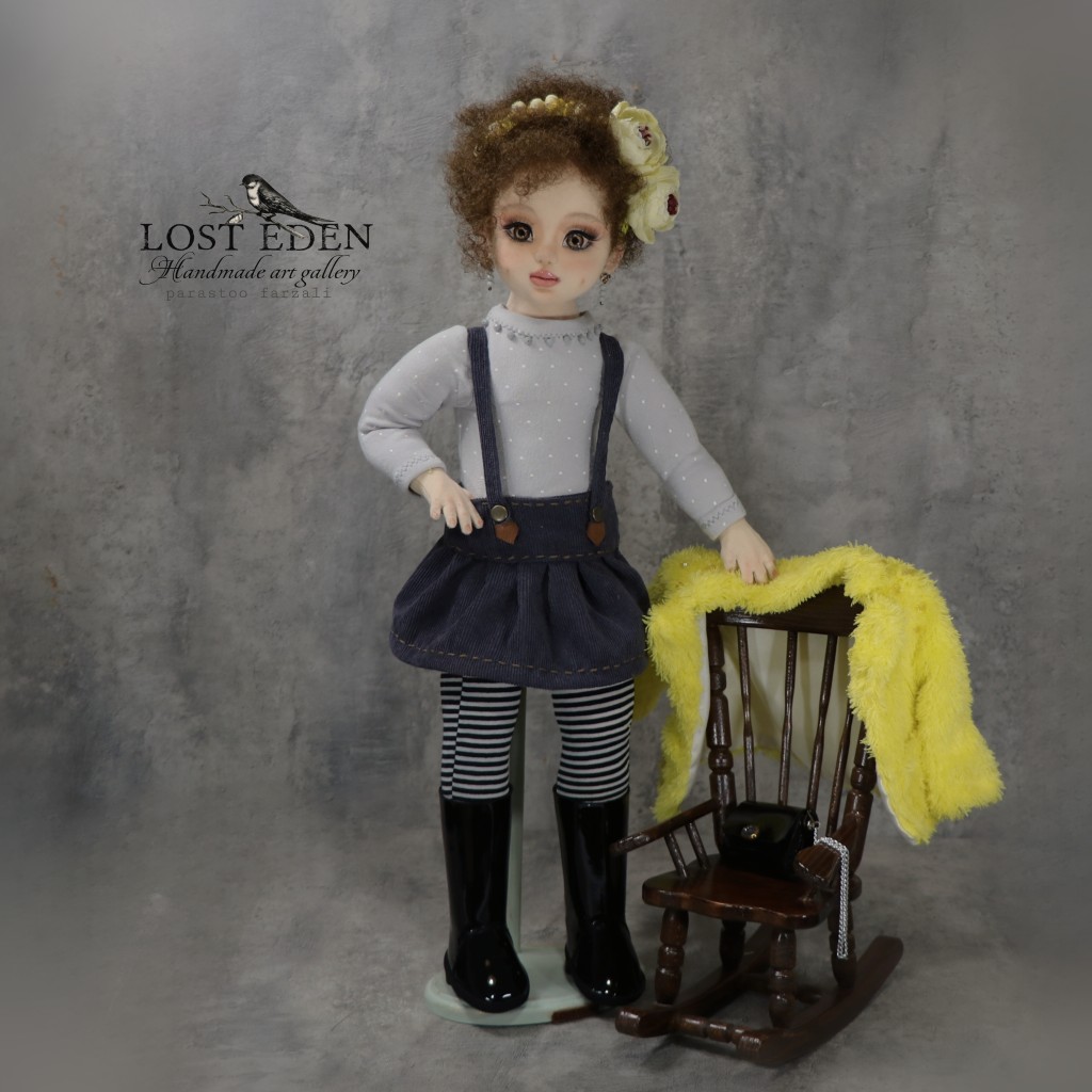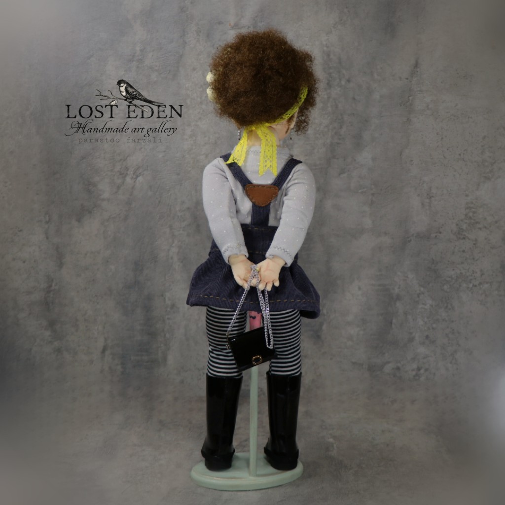 زلدا(دختر جسور و جنگجو)،عروسک دستساز پارچه ای سه بعدی با جعبه چوبی ویترینی لوکس